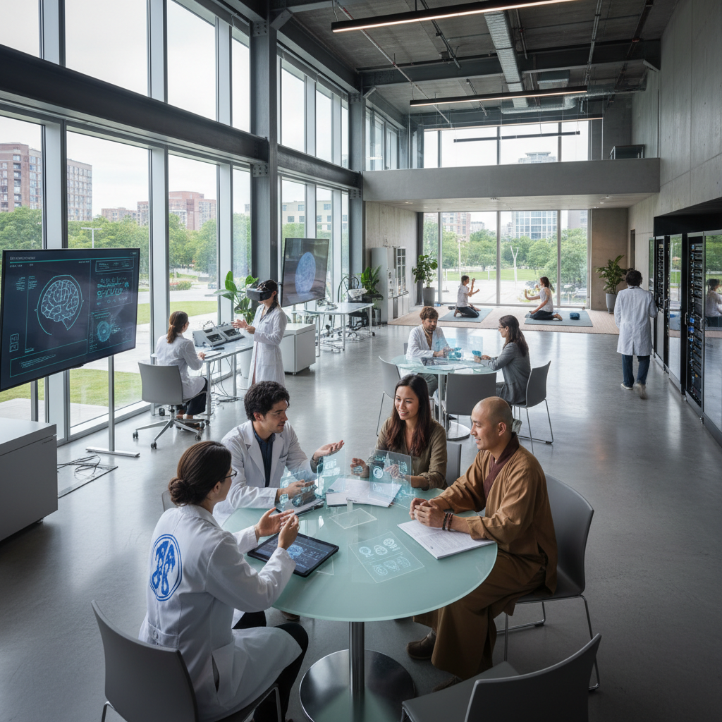 Diverse group of researchers and meditation practitioners collaborating in modern research facility